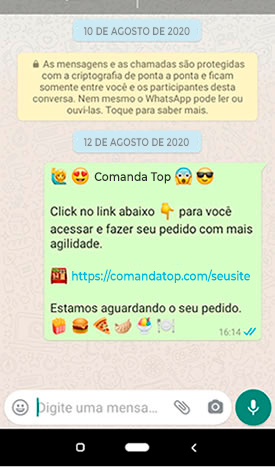 Você não precisará mais competir com vários concorrentes dentro do mesmo aplicativo e perder vendas. Com o Comanda Top você tem uma plataforma inteiramente sua, e que lhe proporcionará até 60% a mais possibilidades de venda. Será gerado um link para divulgação e você compartilha por e-mail, e redes sociais como o Whatsapp.